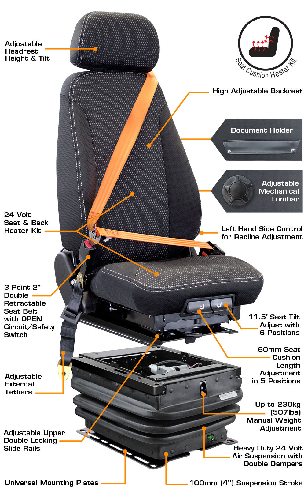 - Heavy Duty 24 Volt Air Suspension with Double Dampers