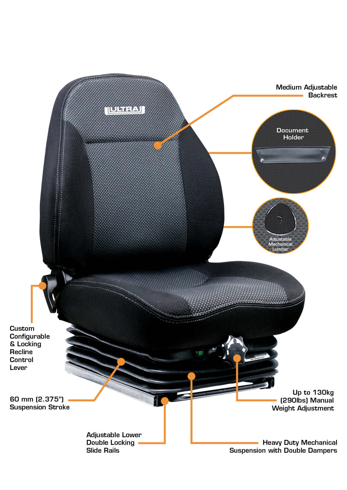 - Heavy Duty Low Profile Mechanical Suspension with Double Dampers